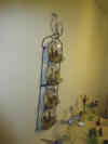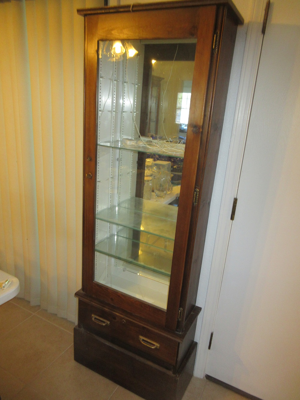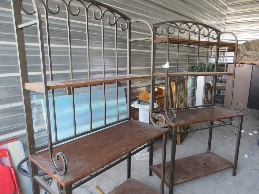 set; pine curio cabinet; nice bar & 2 stools; several baker's racks; round oak