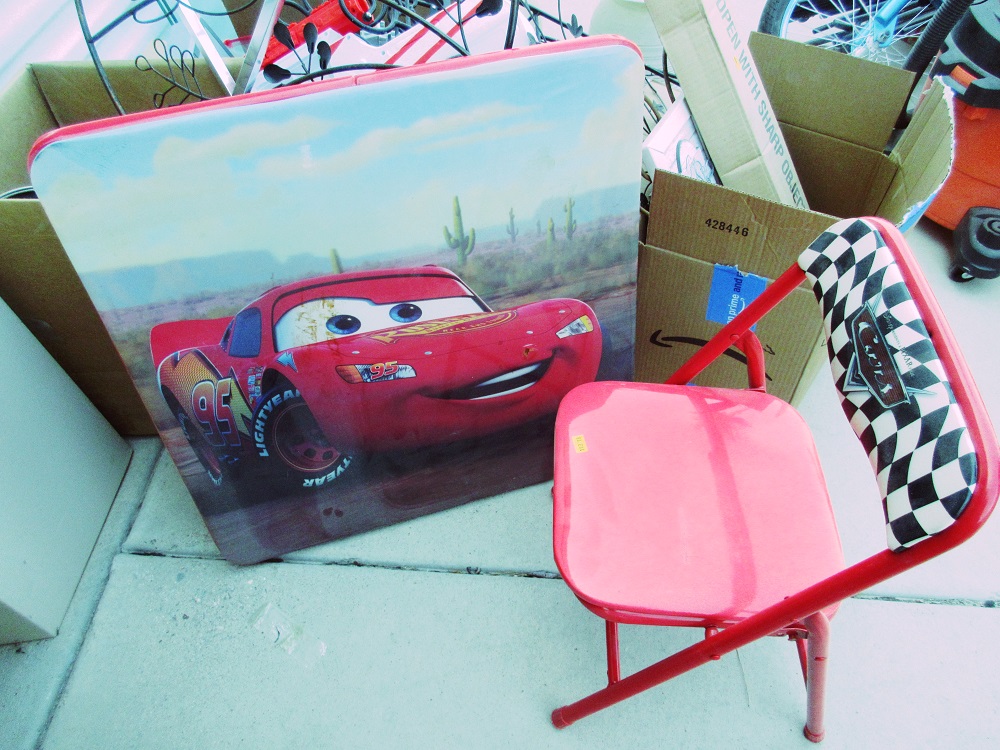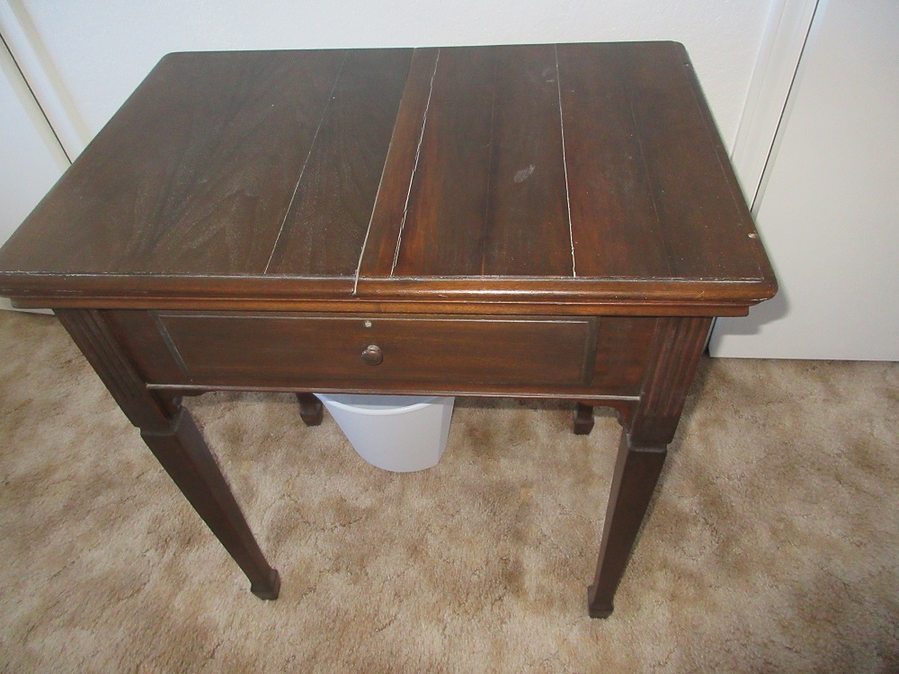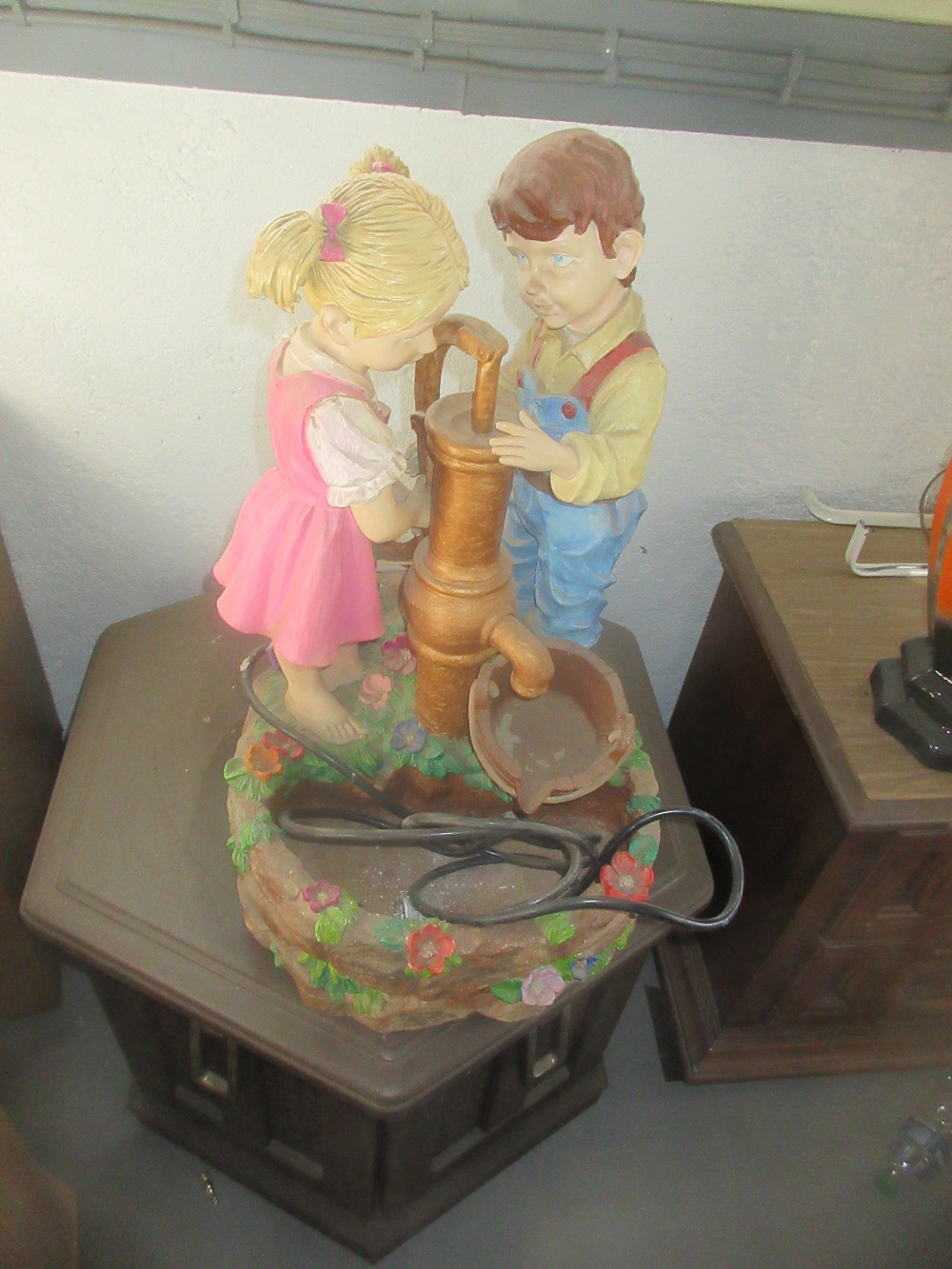 movie camera; "boy and girl" fountain; Pfaff sewing machine; Teak stereo; truck