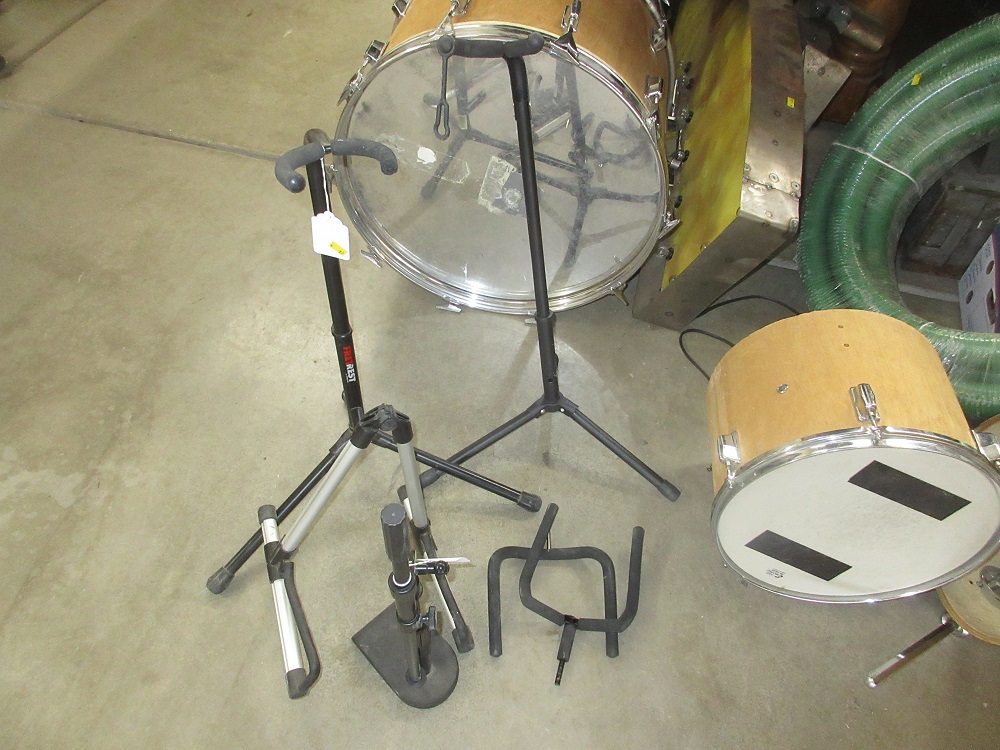 80's Pearl Japan hybrid wood & fiberglass drum set; snare drums; guitar & mic