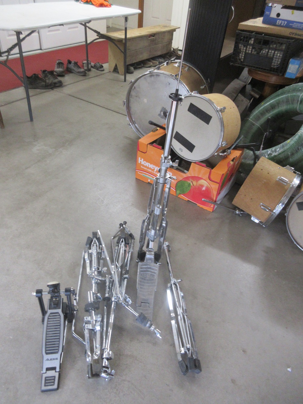 AM/FM/8-track/record player; Aldis slide projector; footed iron kettle; railroad
