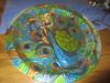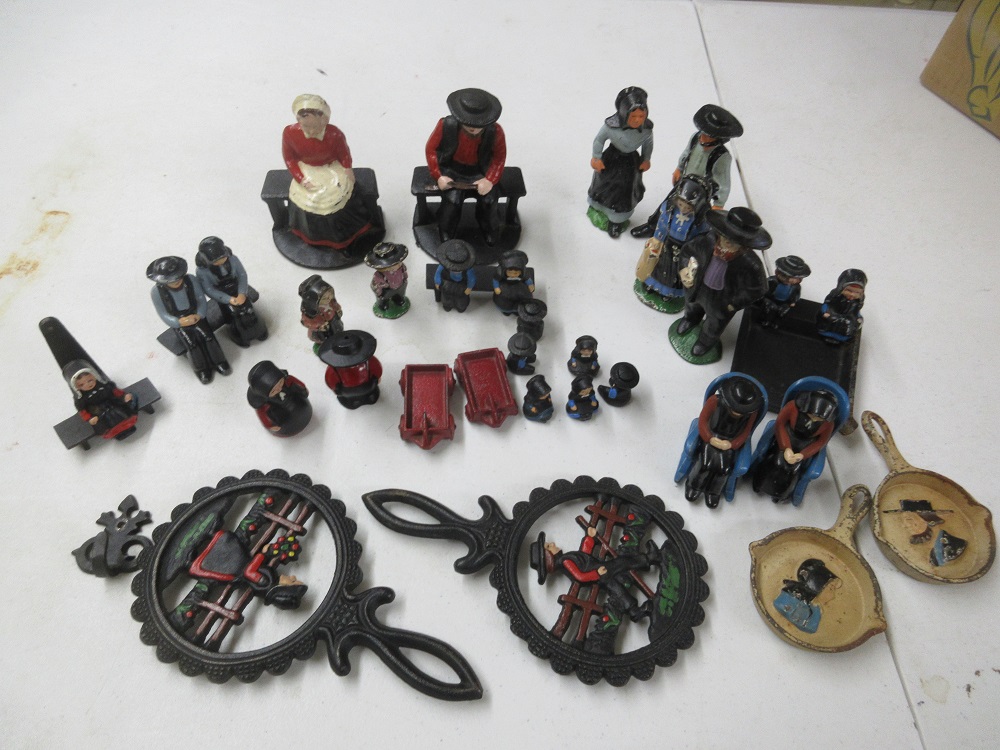 marbles; iron toy horse drawn sleigh; blue bird decorated crock; costume