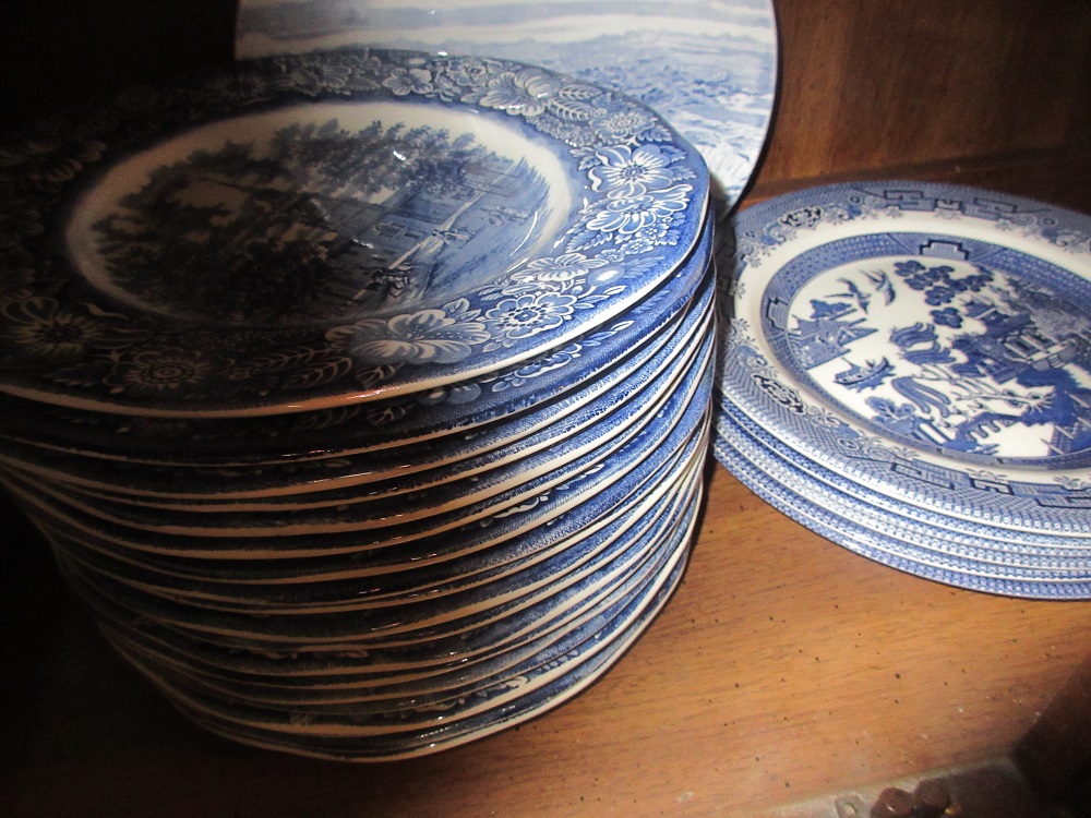 set of Liberty Blue ironstone dinnerware; blue willow china plates; piano stool;