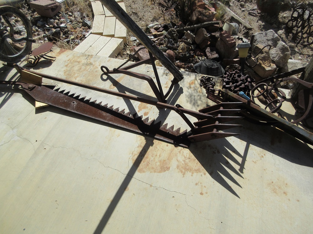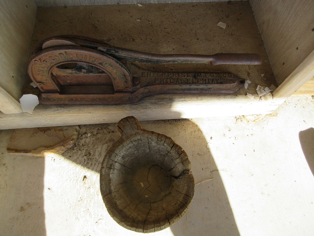 grinding wheel; Handyman Harrah high lift jack; tobacco cutter; leather vise;