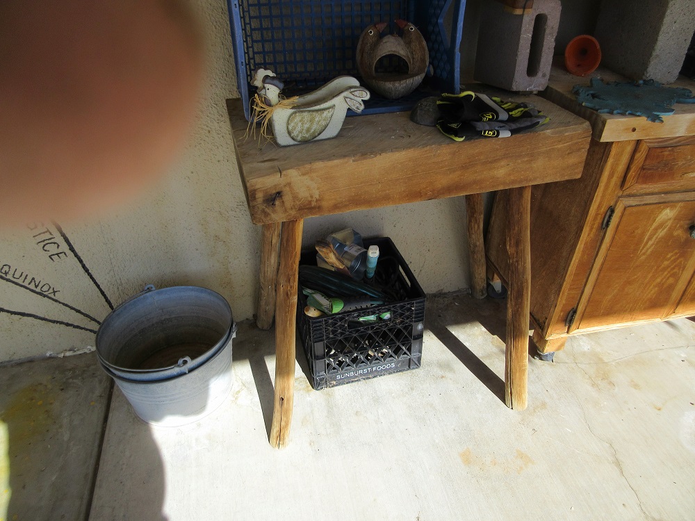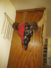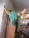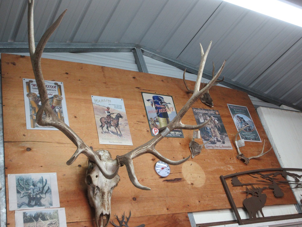 turquoise decorated; elk skull with rack; plank benches; coffee grinder; pedal