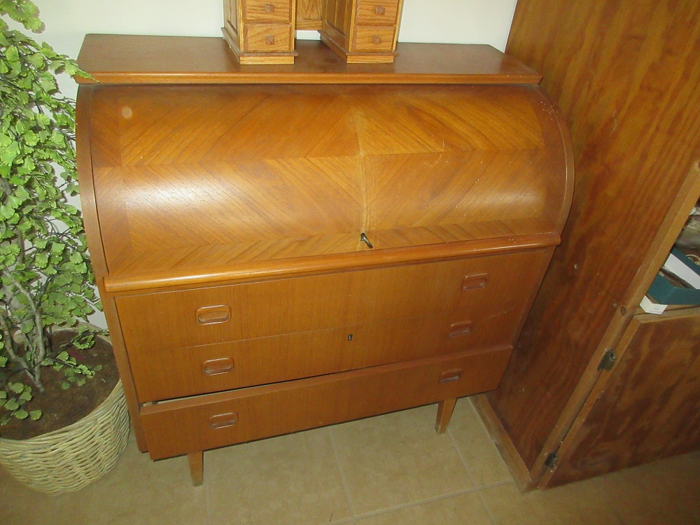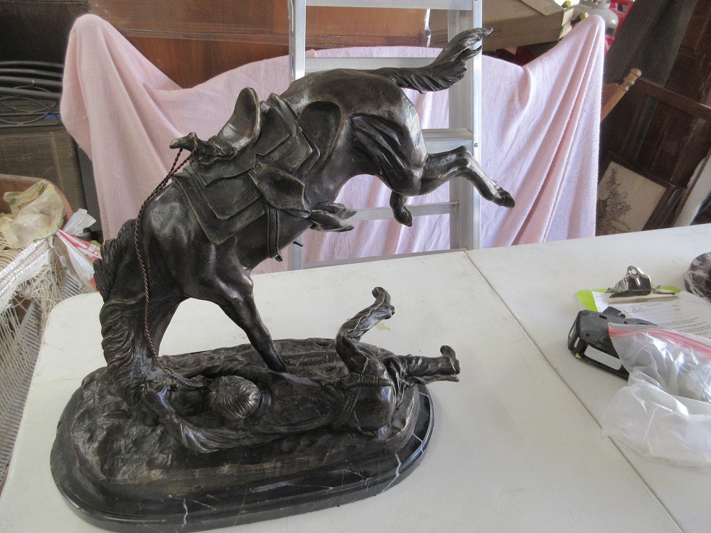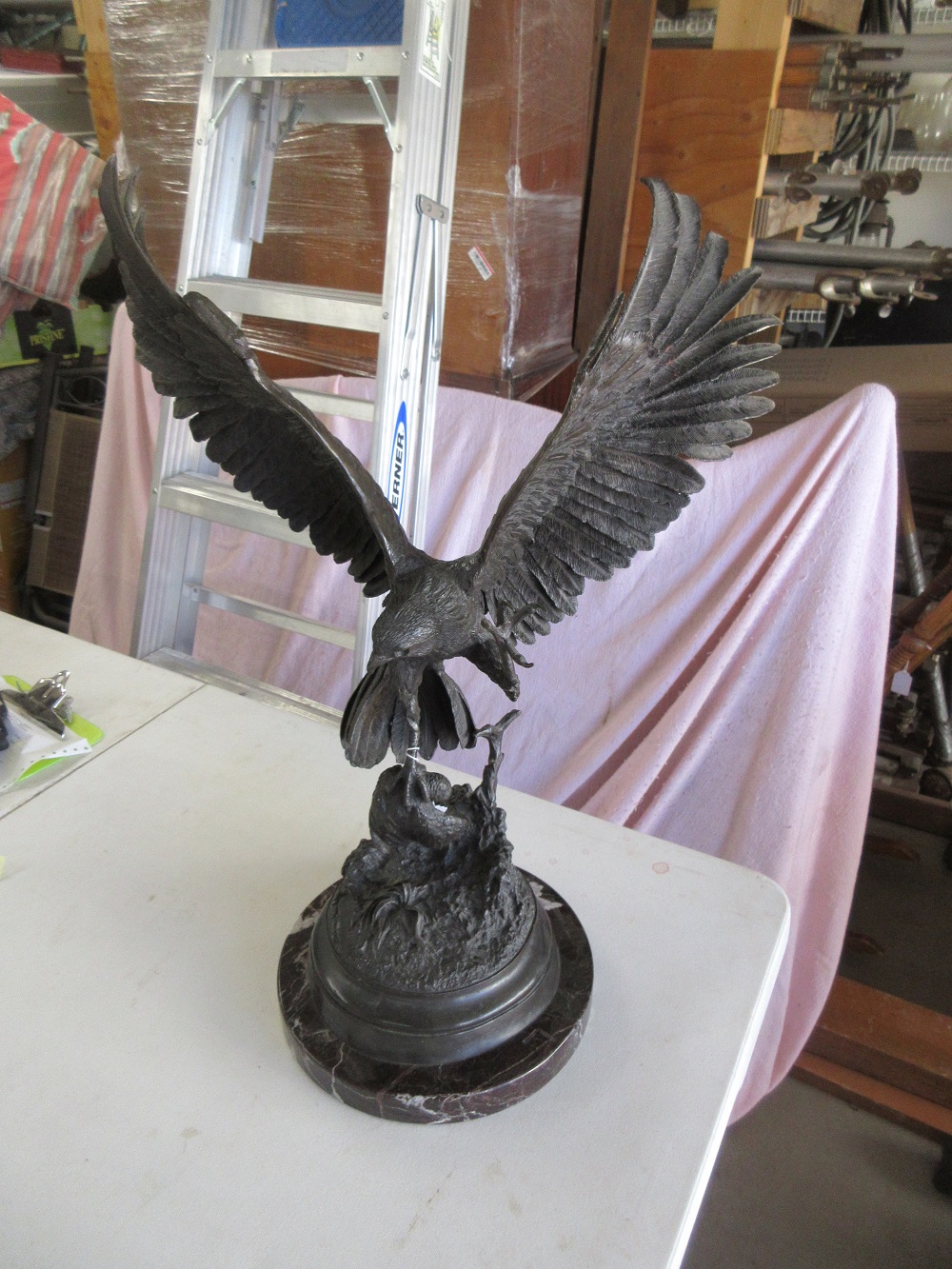 eagle bronze by Jules Moigniez; Remington bronze - "Wicked Pony"; mahogany cylinder roll desk; pine bench; storage stand; barrel chair; toy
