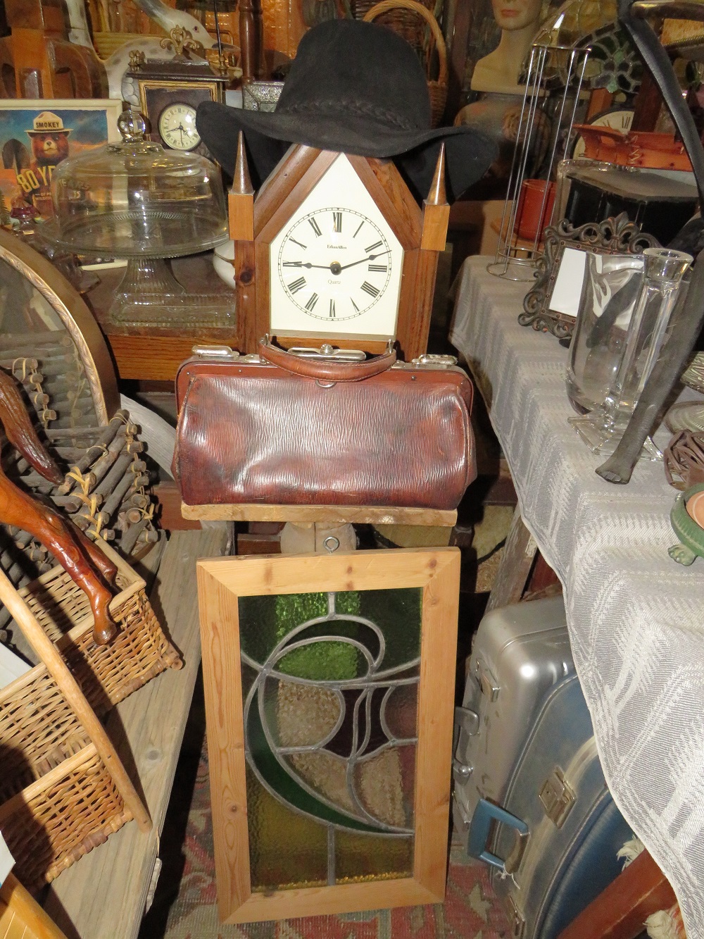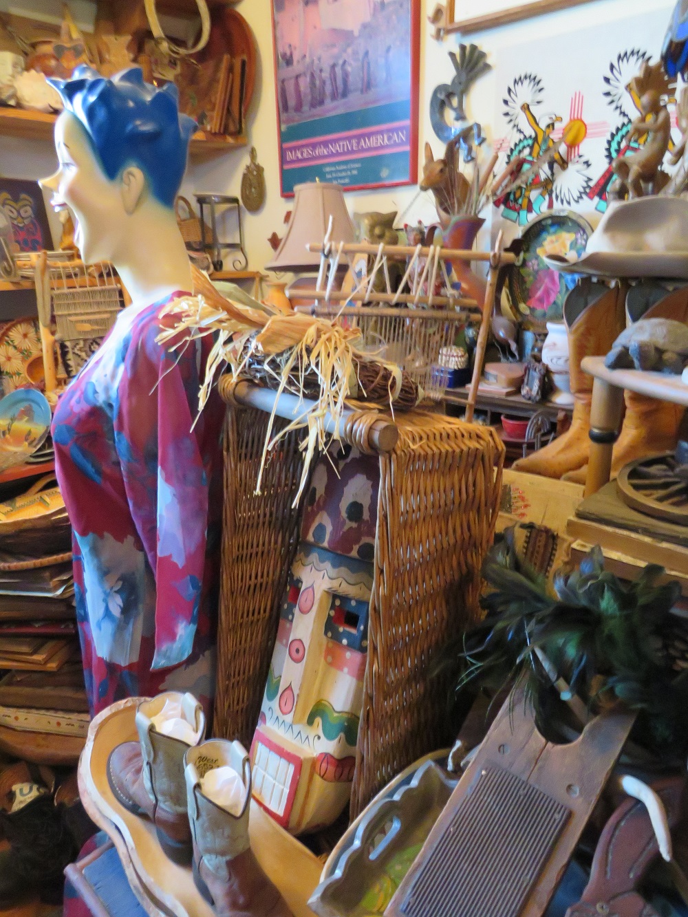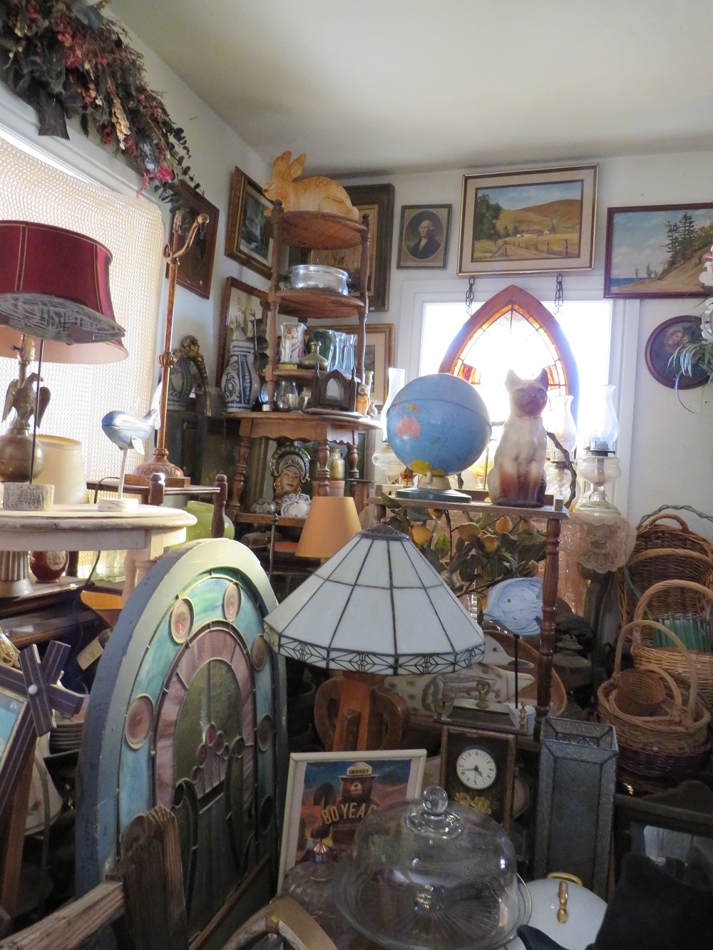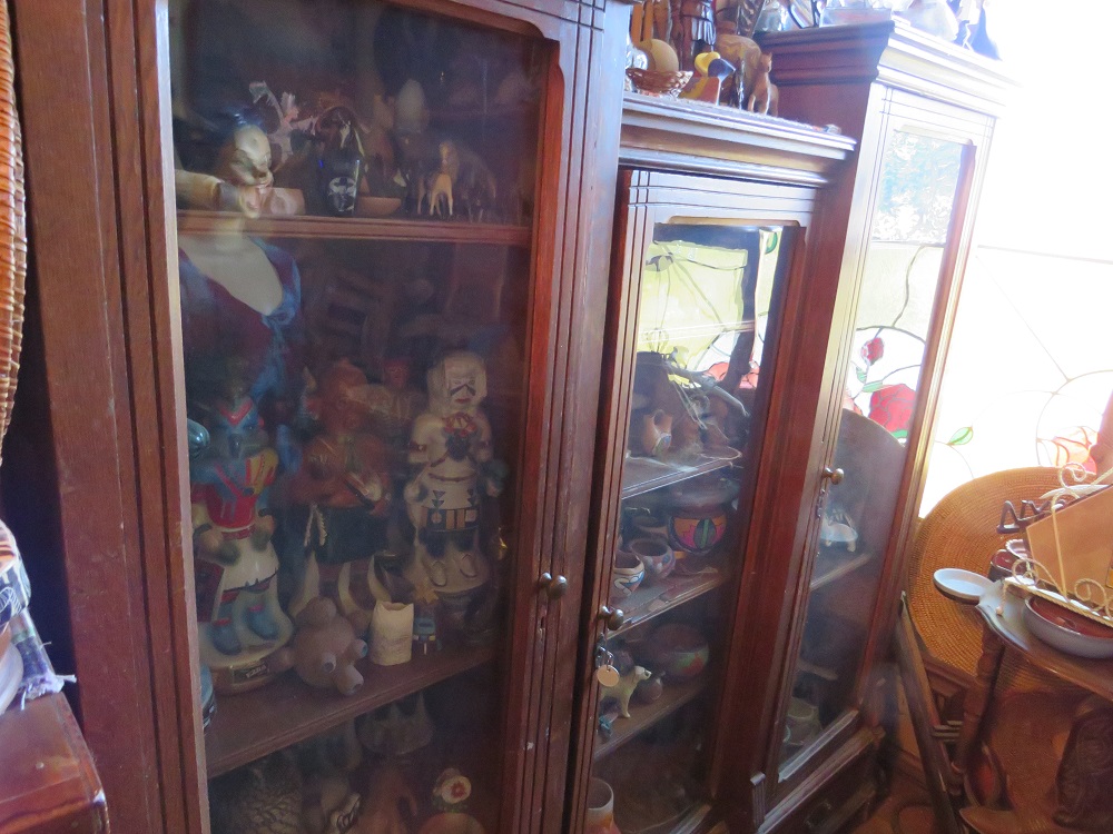 curio cabinets; desks incl. lady's rolltop; oak triple bookcase; twig furniture incl. doll; country furniture incl. china cabinet; many stands incl. marbletop; tables; benches; coin operated telephone; stoneware jugs & crocks incl. 3 gallon Redwing crock; advertising signs & racks; early calculator in case; lots of spurs incl. children's; branding irons; many pairs of cowboy boots; cowboy hats incl. Chris Eddy; copper fire extinguisher; radios; statuettes incl. art nouveau; Windproof lighter collection; family scales; enamelware; Pyrex; ice cream freezer tin; milk & cream bottles; kitchenware; Native American decor, basket, & carpets; lots of art work; bookcases; Marlin & Co mandolin; wooden bench with wheel decoration; many clocks incl. Regulator & Seth Thomas; Angeles tricycle; many vintage hanging lamps; leaded stained glass parlor lamps; ironware; castiron train set; toy tin steam shovel; silver plated items; incl. flatware; sterling; Lladro; World Globe; kerosene lamps; lanterns; folding screen; stained glass panels; baskets; & tons more.