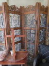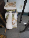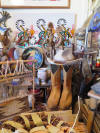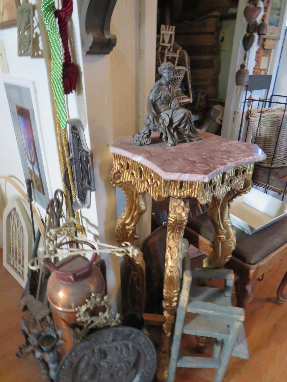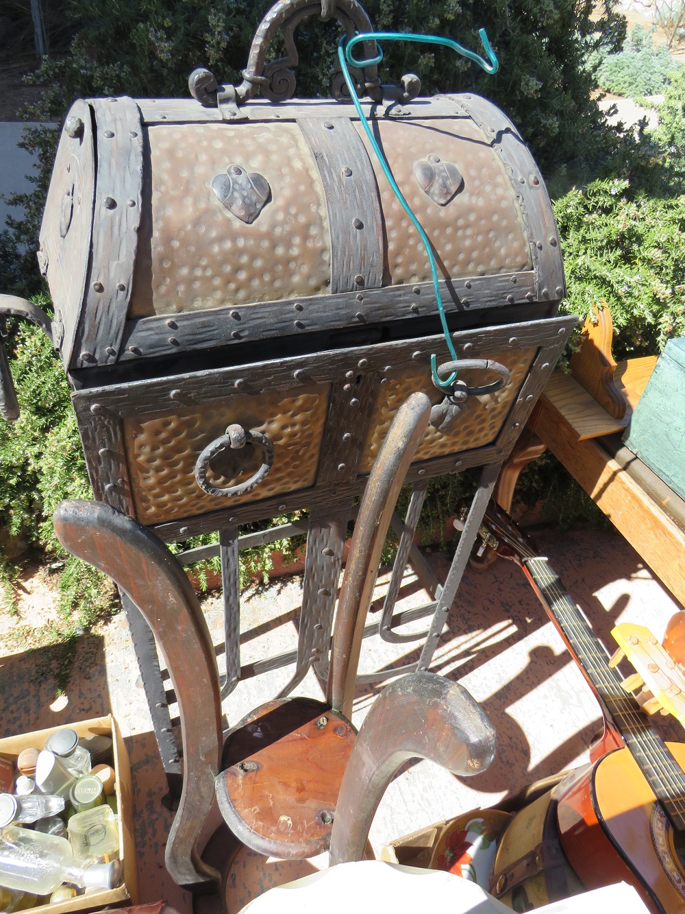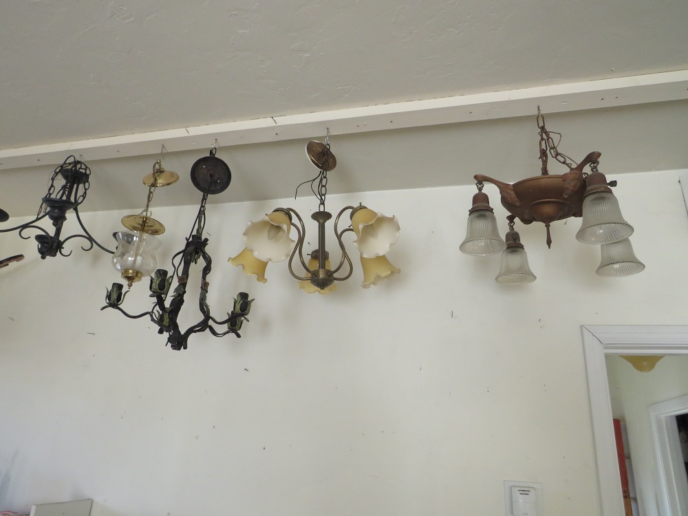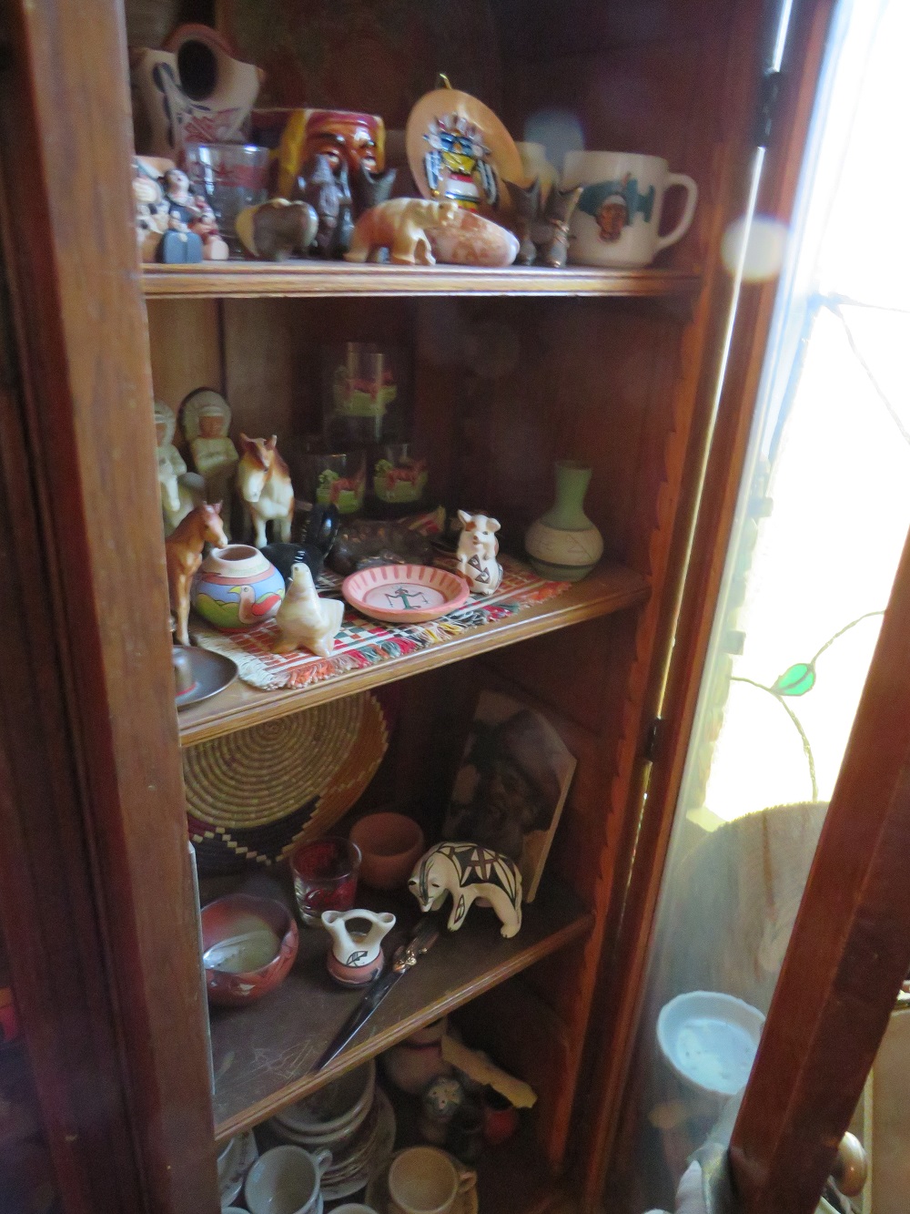 curio cabinets; desks incl. lady's rolltop; oak triple bookcase; twig furniture incl. doll; country furniture incl. china cabinet; many stands incl. marbletop; tables; benches; coin operated telephone; stoneware jugs & crocks incl. 3 gallon Redwing crock; advertising signs & racks; early calculator in case; lots of spurs incl. children's; branding irons; many pairs of cowboy boots; cowboy hats incl. Chris Eddy; copper fire extinguisher; radios; statuettes incl. art nouveau; Windproof lighter collection; family scales; enamelware; Pyrex; ice cream freezer tin; milk & cream bottles; kitchenware; Native American decor, basket, & carpets; lots of art work; bookcases; Marlin & Co mandolin; wooden bench with wheel decoration; many clocks incl. Regulator & Seth Thomas; Angeles tricycle; many vintage hanging lamps; leaded stained glass parlor lamps; ironware; castiron train set; toy tin steam shovel; silver plated items; incl. flatware; sterling; Lladro; World Globe; kerosene lamps; lanterns; folding screen; stained glass panels; baskets; & tons more.