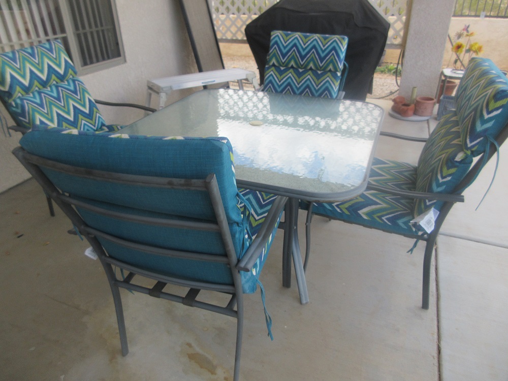 Pyrex; Werner bench; yard art; patio set; plastic table & chair set; plastic cabinets;