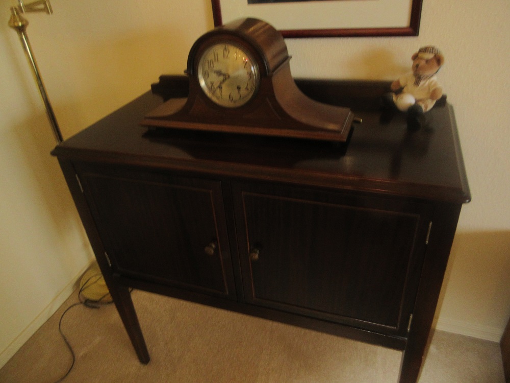top coffee table; easy chair & footstool set; music cabinet; early1900's