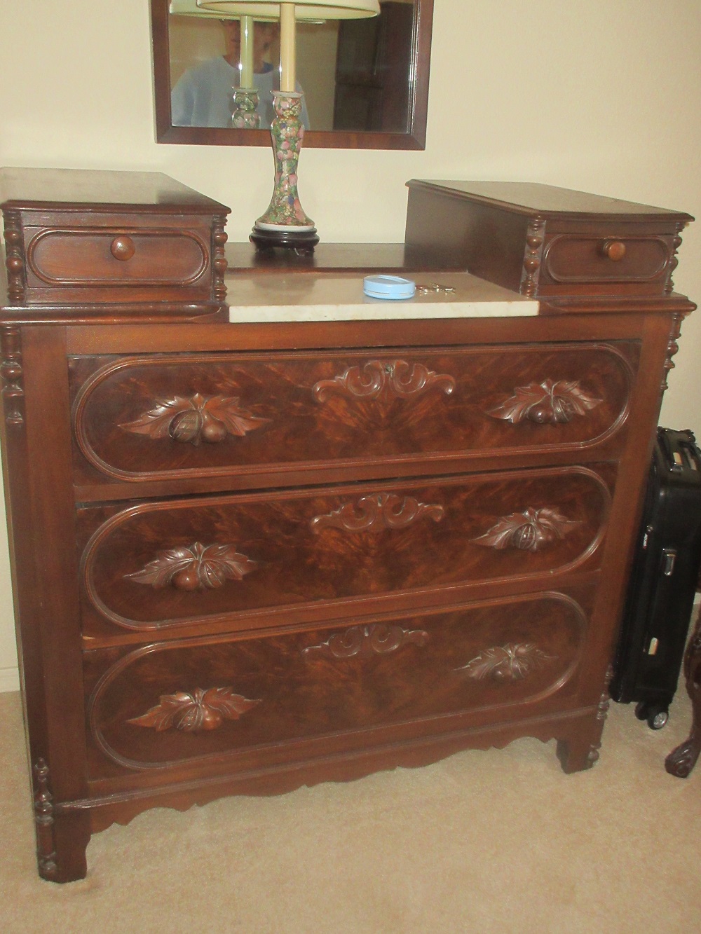 marbletop chest of drawers with fruit carved handles; ball & claw footed library