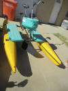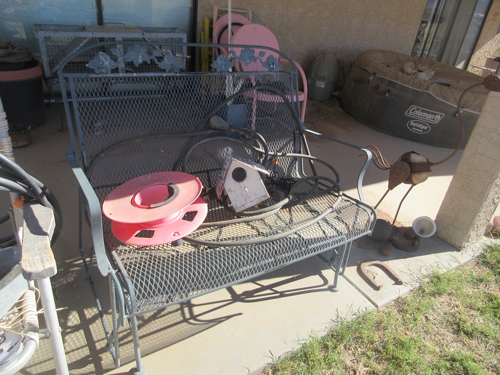 ladder; cement mixer; table saw; vintage tools; yard art incl. metal bicycles, John Deere