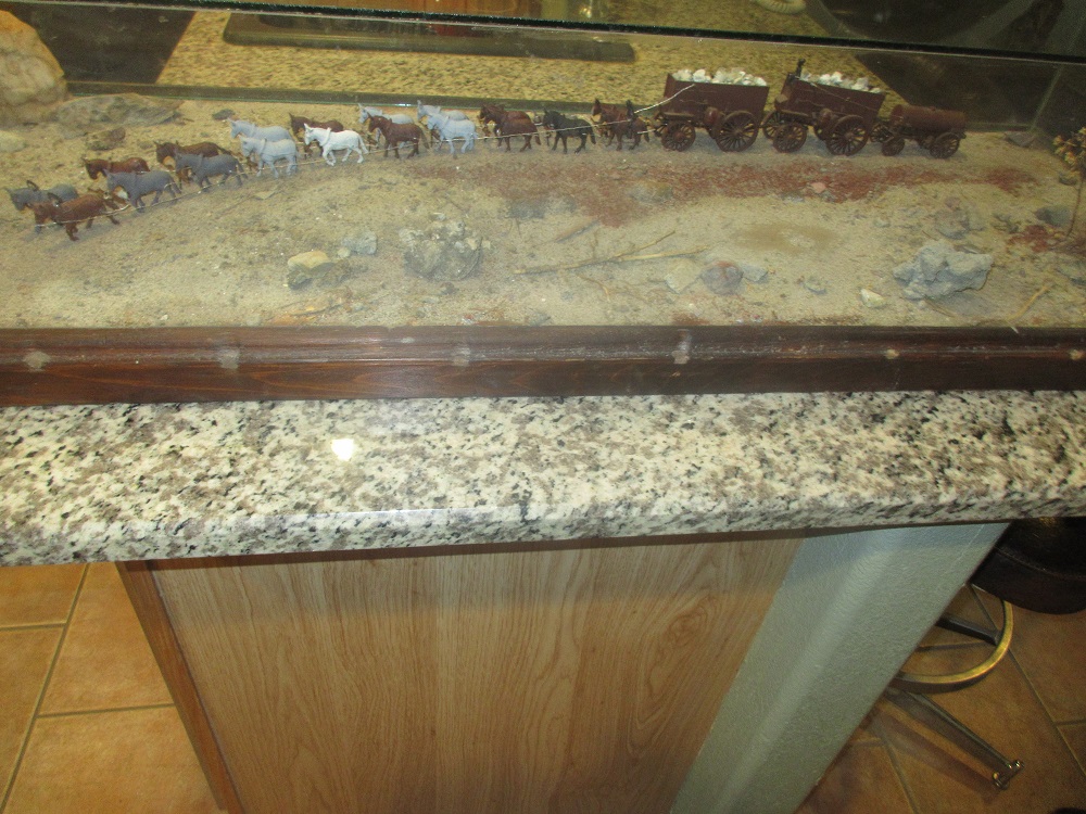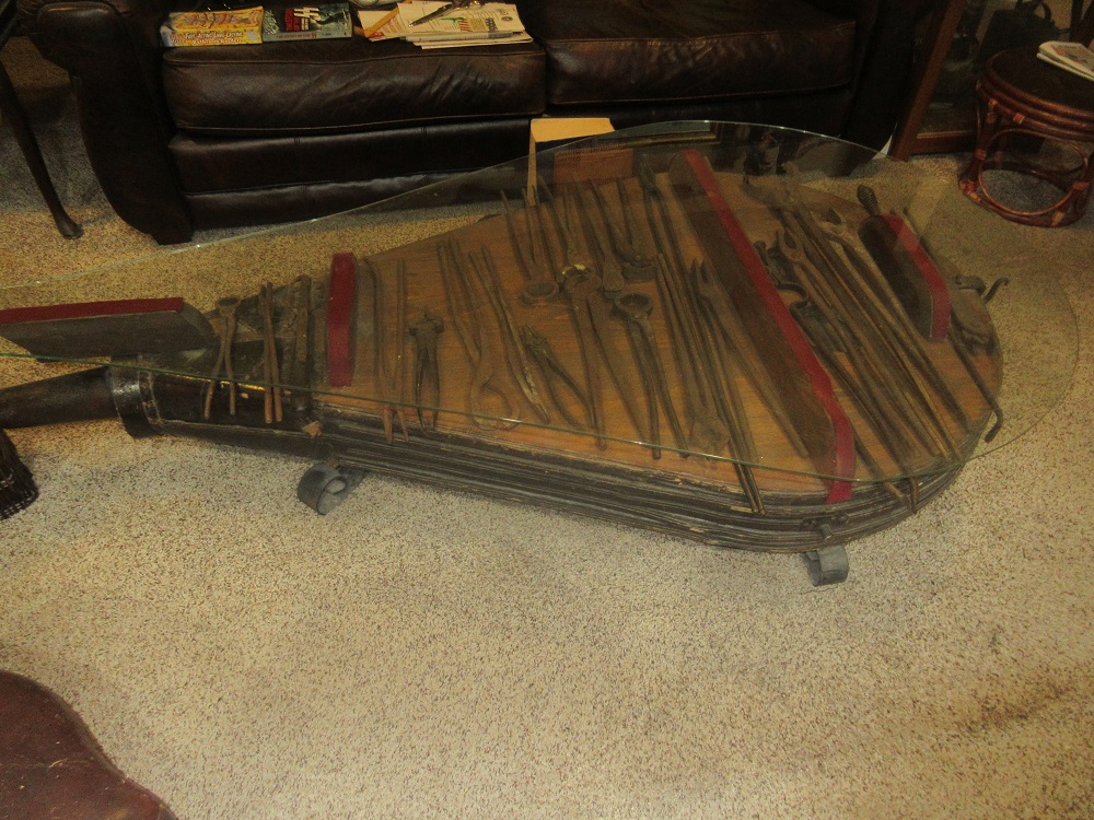 coffee table with blacksmith's tools displayed; Borax 20 mule team in