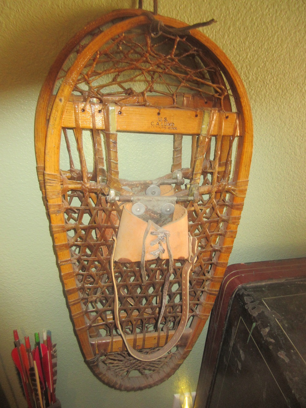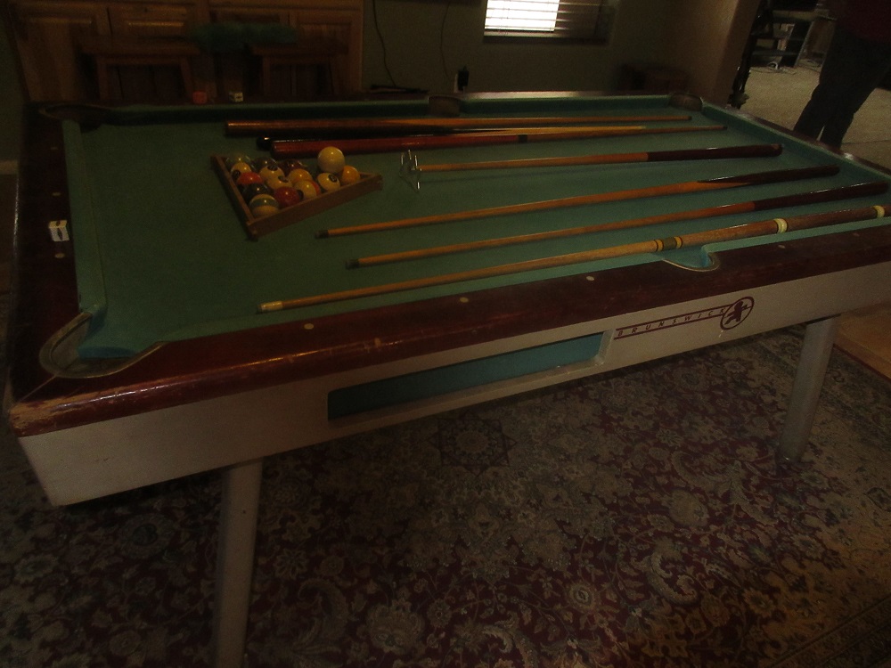 pool table; pair of CA Lund, Hastings, MN, snowshoes; blacksmith's bellows