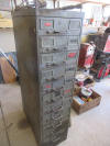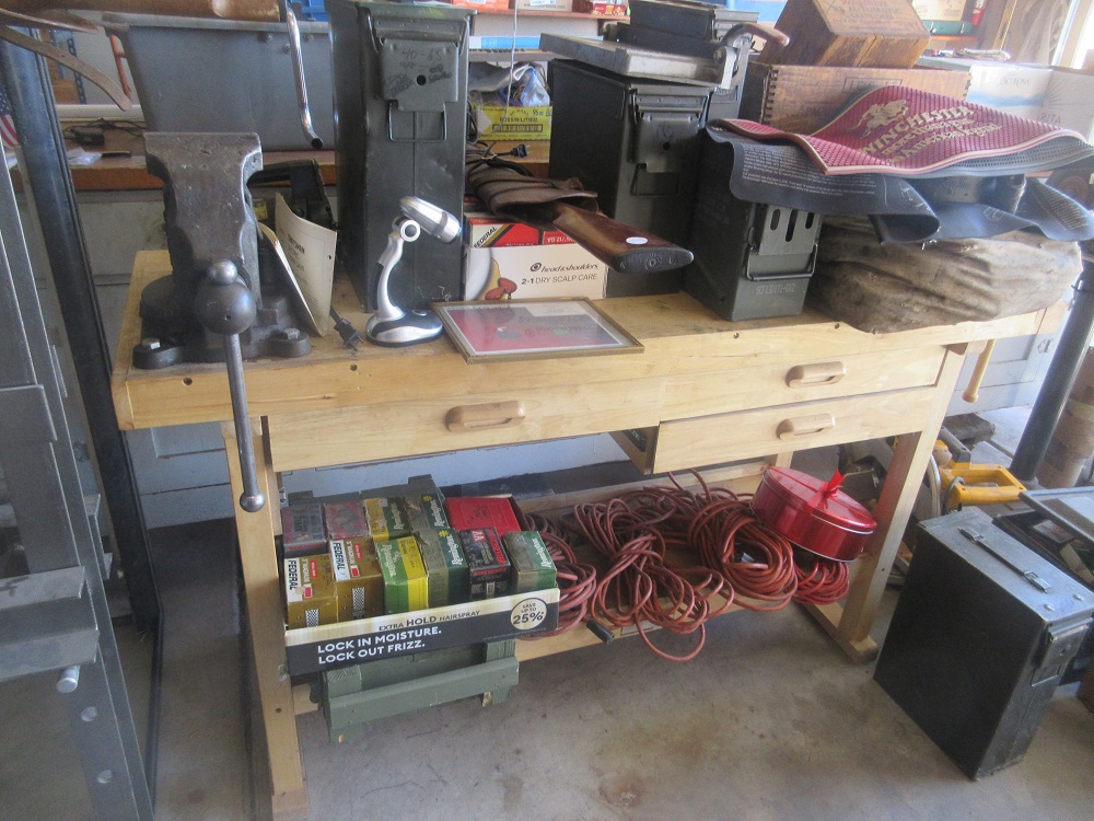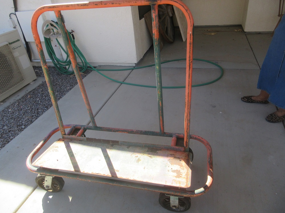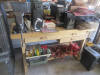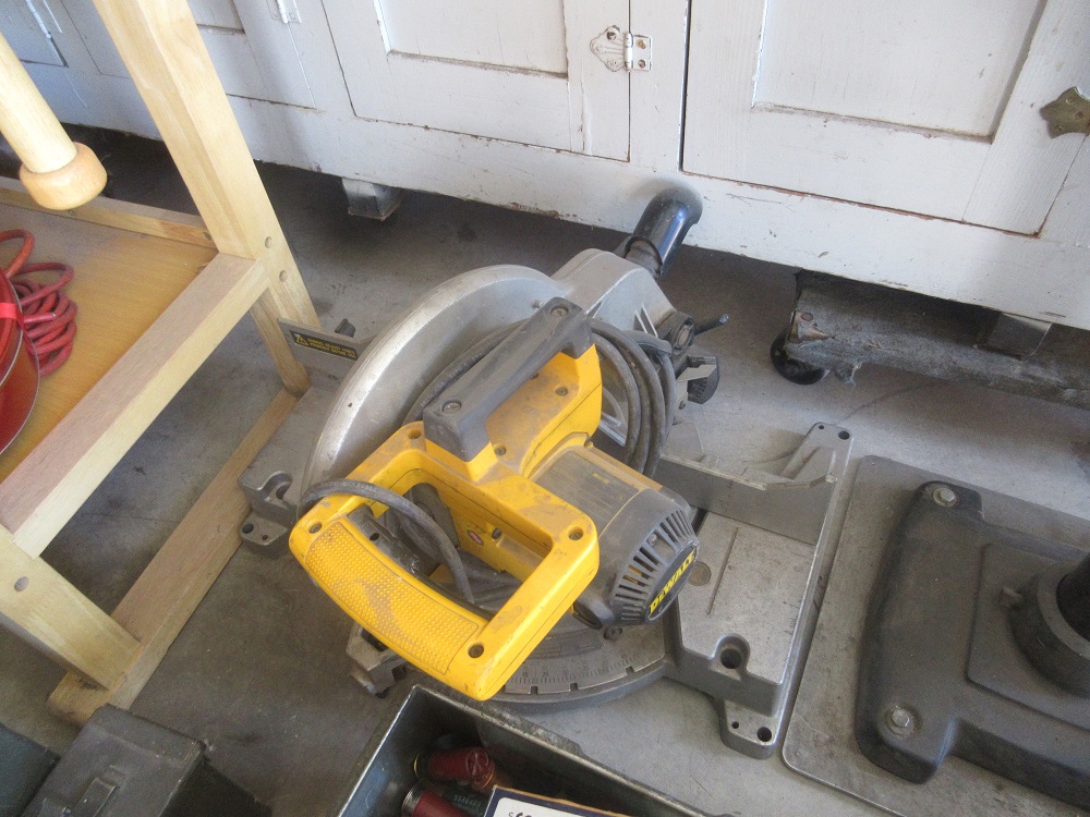 saw; lay down belt sander; construction cart; metal drawer cabinet; work table;