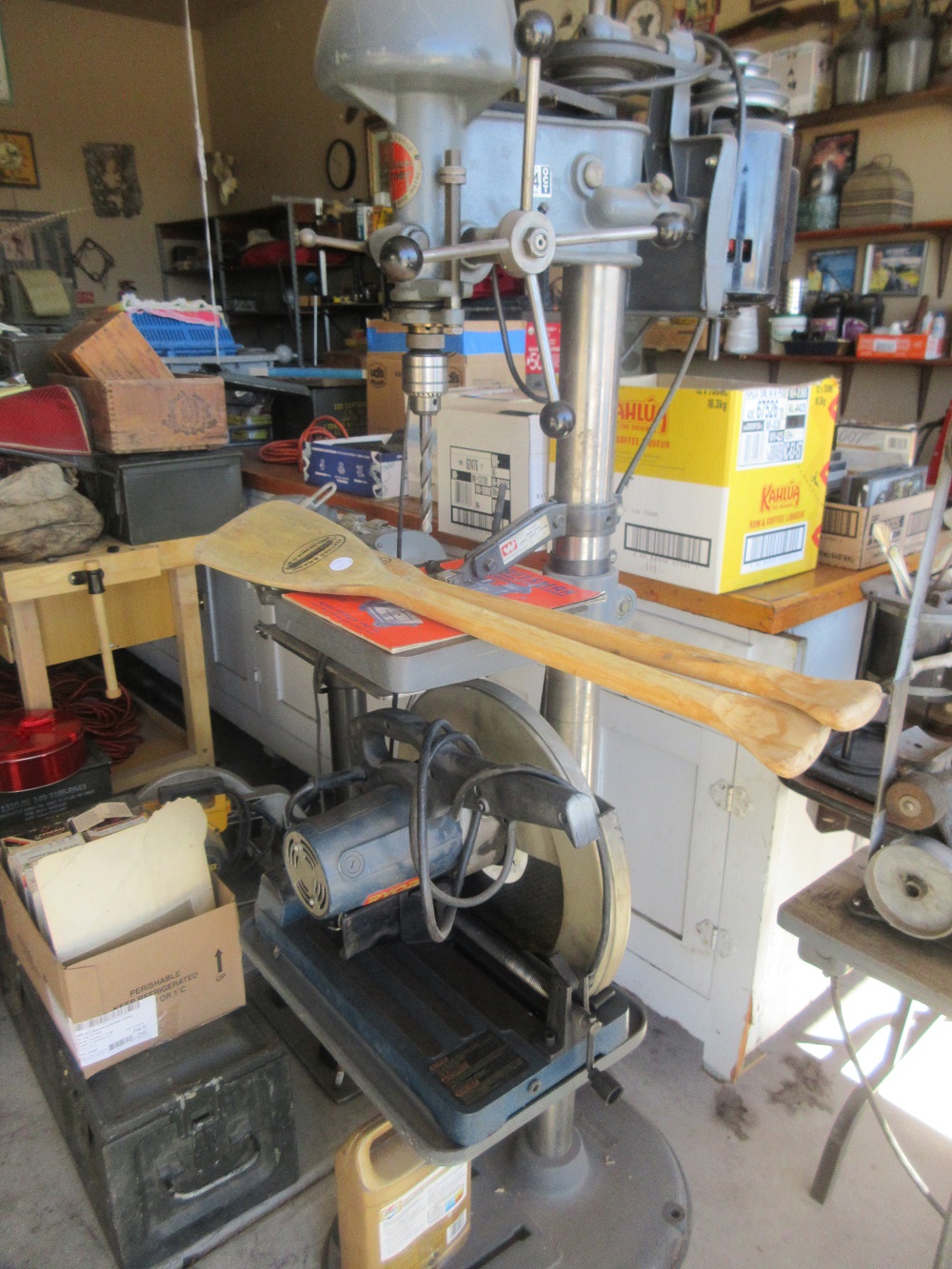 feed welder; acetylene welder; compound miter saw; Rockwell band saw; Walker-Turner drill press