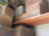 calendar; many wooden advertising & explosives crates; pork sausage advertising