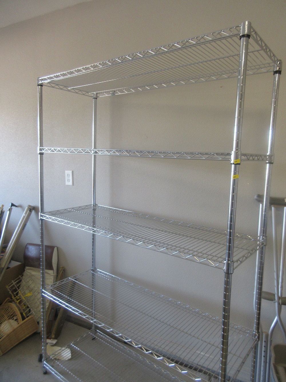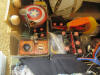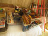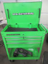 arm saw; roll-around toolboxes; wire racks; battery charger; airbrush; US General tool cart;