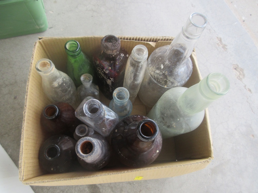 Tonka construction toys; ammo box with knives; bottles; set of Zane Grey books;