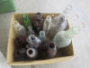 collection of blown glass items; tin signs; dinosaur fossil; coffee grinder;