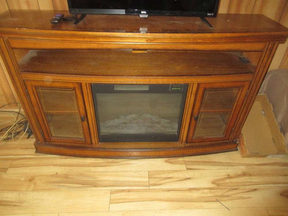 electric fireplace in cabinet; White Speedy Lock serger; Ft Russell trail map;