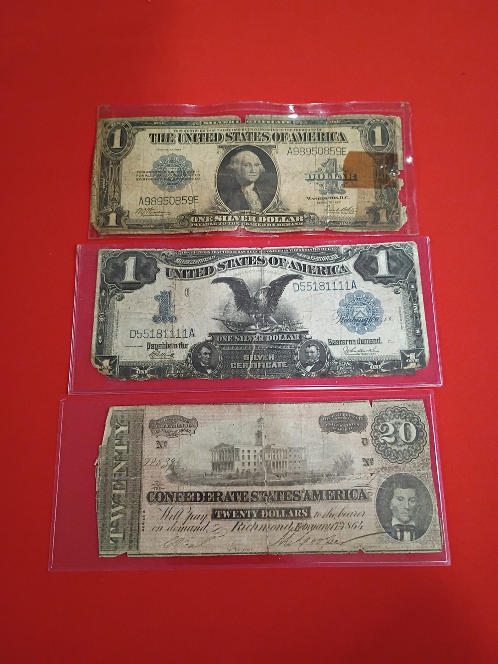 money incl. Confederate & US Military; 1923 dollar bill; consecutive $2 bills;