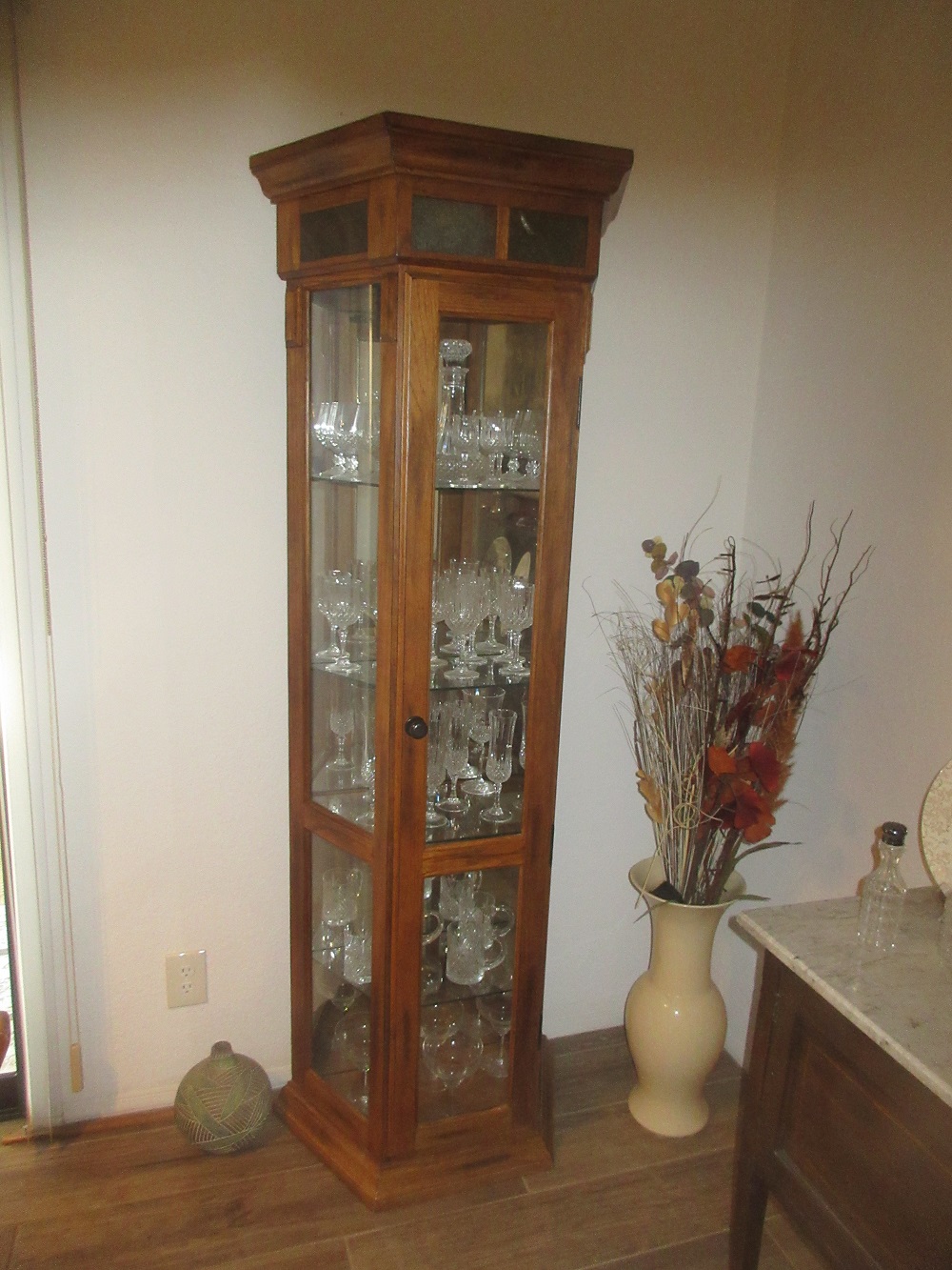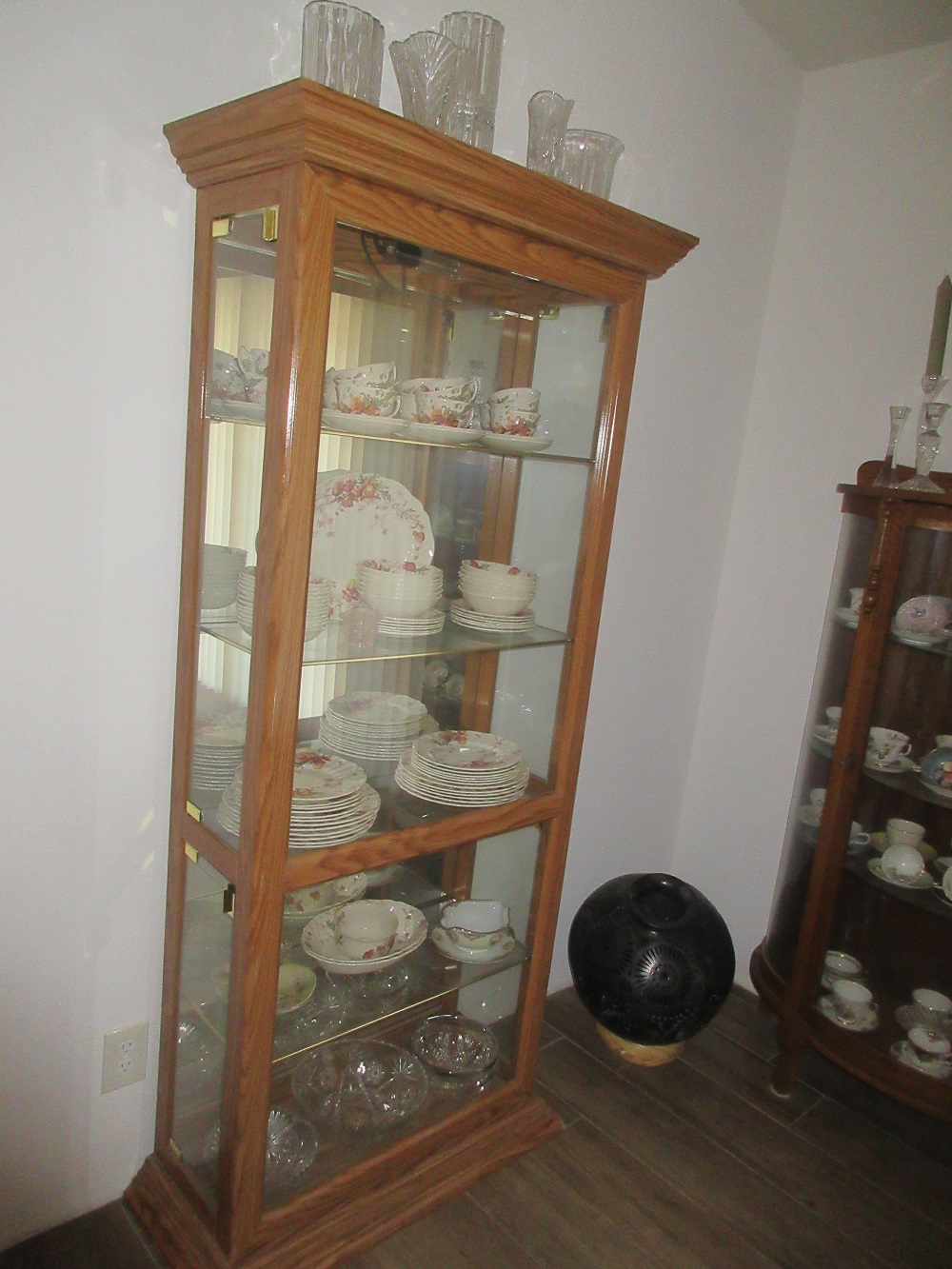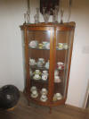 curio cabinets; oak curved glass china cabinet; marbletop dining table & 6