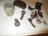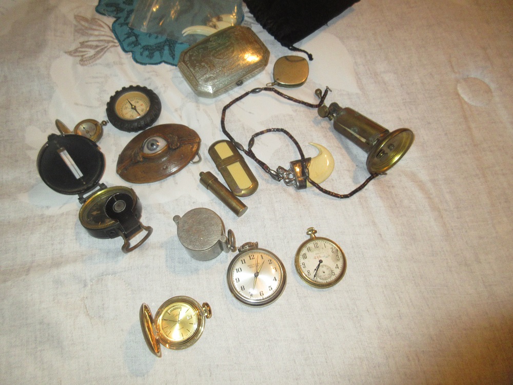 hunter & bird decorations; Sessions "ship's" clock; costume jewelry; pocket