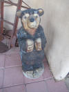 jars; oak highchair; carved bear statue; burl coffee table with tree trunk base;