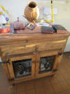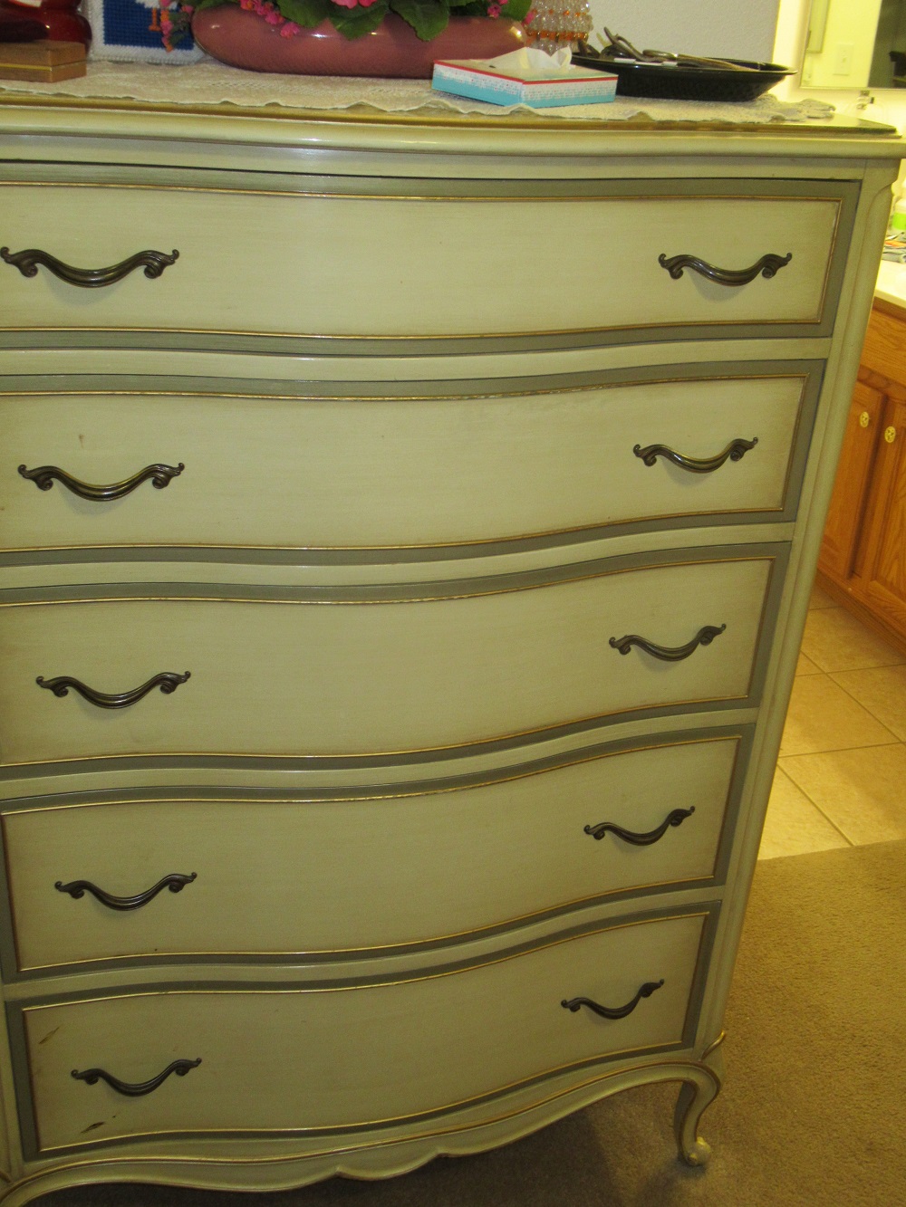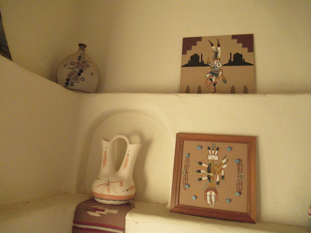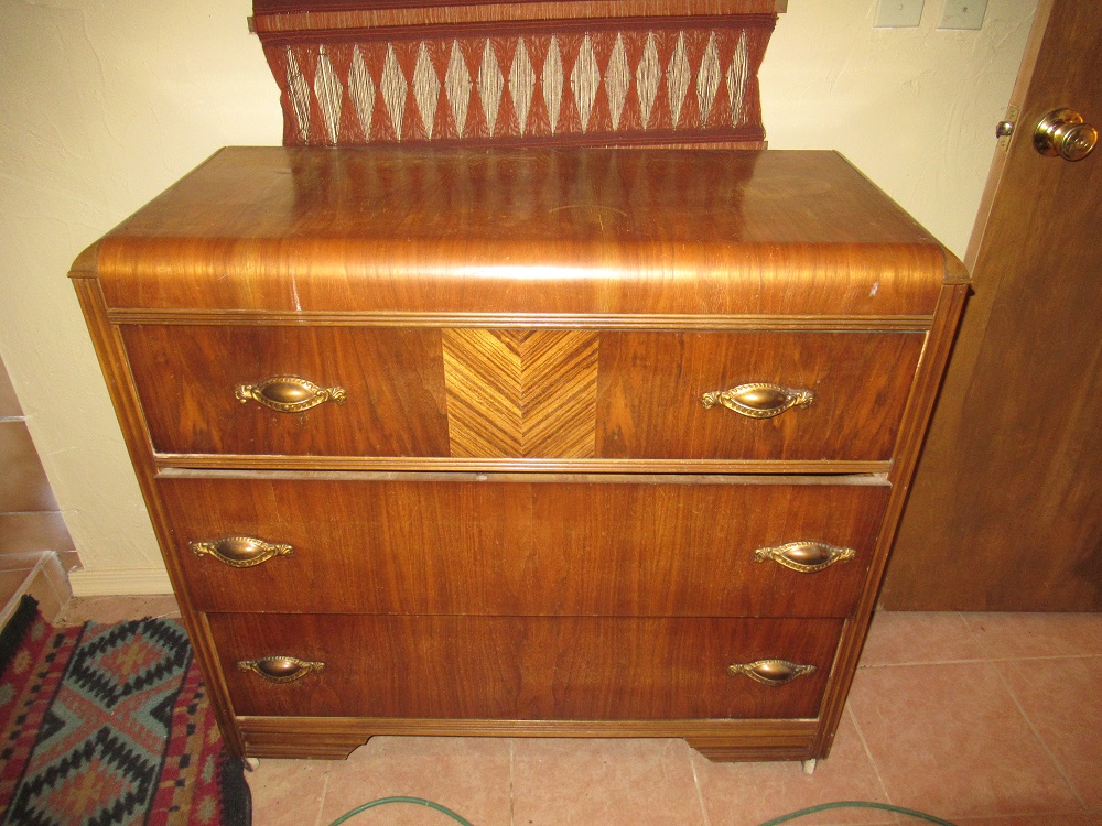 footed iron kettles; mahogany art deco dresser; Navajo carpet; vintage roller