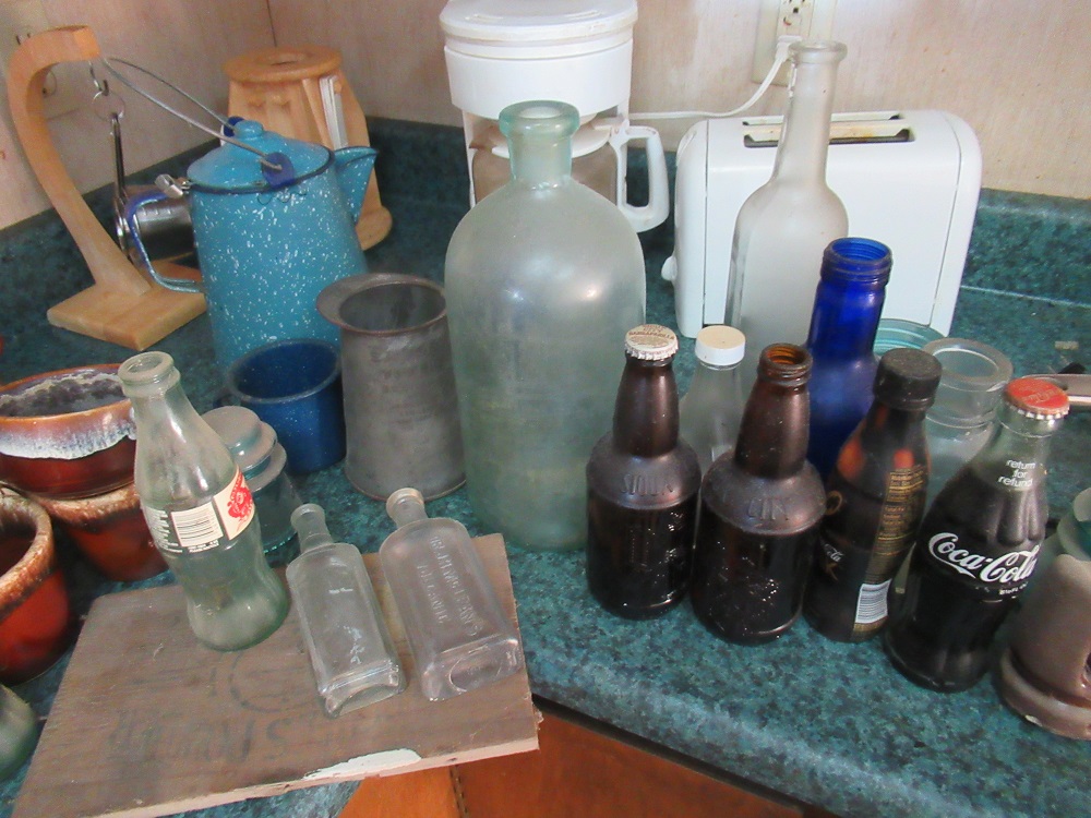 wire display; Griswold waffle iron; iron teapot; Pyrex; galvanized tub;