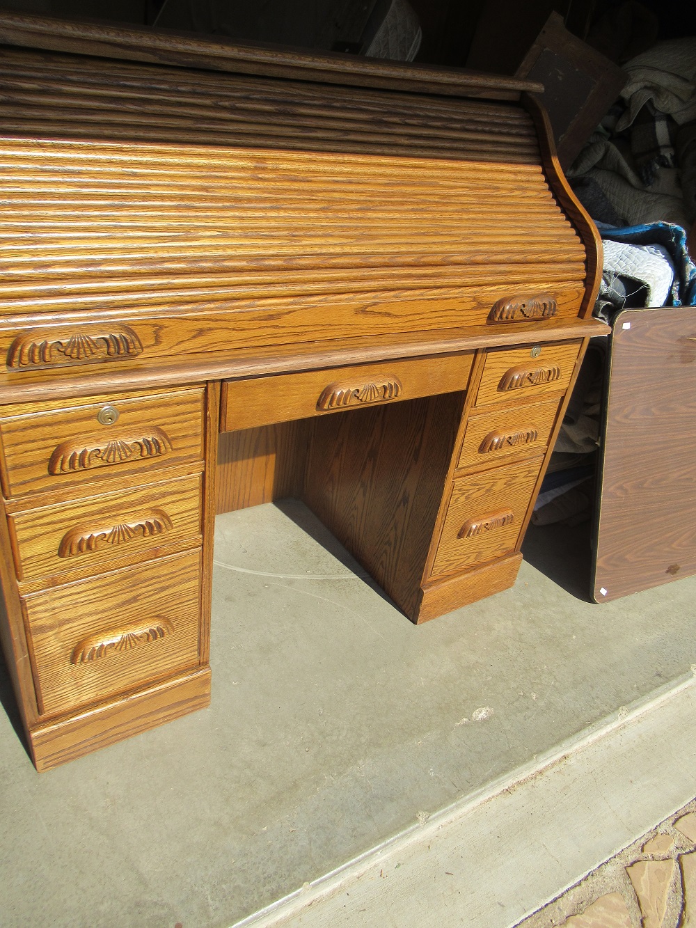 oak rolltop desk; 2 round oak table & chairs sets; mounted deer & antelope